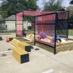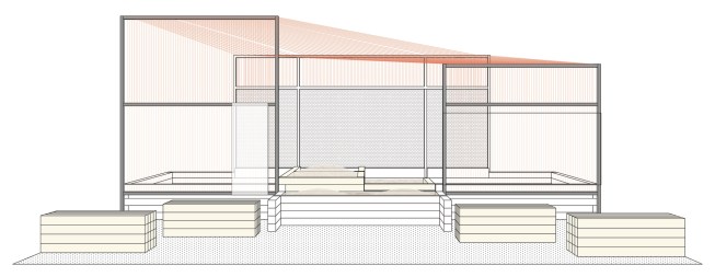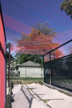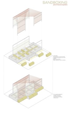 SANDBOXING is a pavilion/game designed by Quilian Riano (DSGN AGNC) for the New Cities Future Ruins** convening in Dallas, TX in which players are asked to playfully negotiate two key resources for the future of the southwestern city: land (sand) and water. This all happens in a pavilion, installed in Old East Dallas’ Jubilee Park, made up of a sandbox designed to change as players negotiate space and a structural dew-catcher canopy — a passive system used in arid climates to extract water particles from the atmosphere. Without any outcome prescribed, players are left to make the choices of sharing collectively or further restricting access to ever diminishing resources.