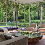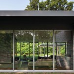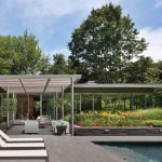 A glass pavilion for living, cooking and dining activities was added to the original structure, and connects the house to new terraces, gardens, a swimming pool and outdoor living spaces. With glass on three sides, the openness of the new pavilion contrasts with the quiet, protective character of the original structure which is used for bedrooms, bathrooms, and a study.