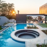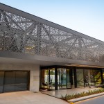 This new 1400 sq.m. 3 storey residence located on a fairly sloped 4100 sq.m. site overlooks Johannesburg East. The design was conceptualised as stacked and intersecting perforated ‘boxes’, which rest on top of each other and intersecting monolithic concrete clad walls. The architectural material palette reflects this monolithic language through the use of dark grey aluminium perforated screens, and concrete panels that adorn the majority of the architectural feature walls.