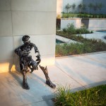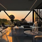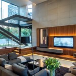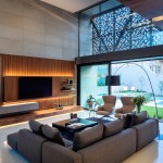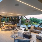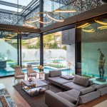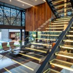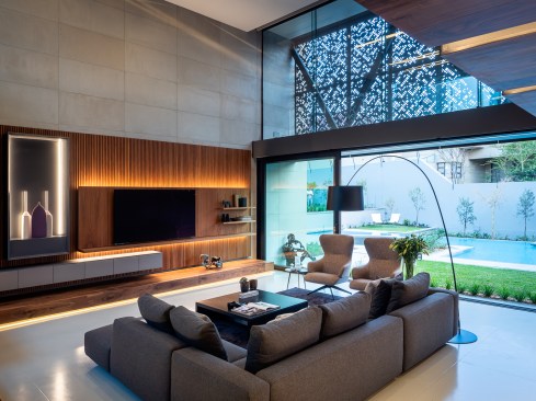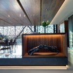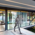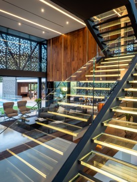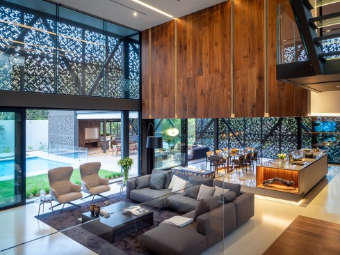 Driving down the driveway on the south side of the home, a triple garage is situated on the left hand side, with a double garage directly ahead past the entrance, and a designated guardhouse with accommodation. Another perforated screen hovers over the glazed entrance, creating a porte cochere.