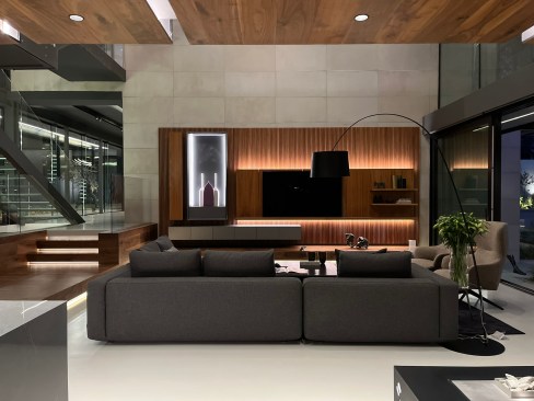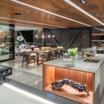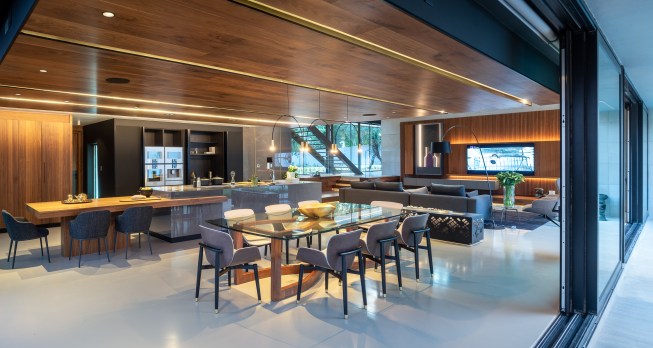 The Interior of the home was designed and intended to introduce warmth and natural tones to offset the heavy exterior through the use of beautiful walnut timber for the flooring in main areas, as well as major shopfitting elements. This was offset through the use of Porcelanosa’s Xtone Liem Grey tiles, with metallic accents to transition these materials.