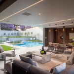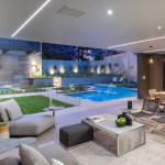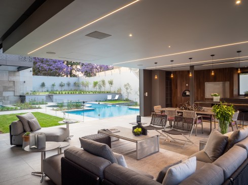 In terms of accommodation and programme, this home features 5 Bedrooms with en suite bathrooms and dressing rooms, a home office and kids’ study, PJ lounge, formal lounge with main open plan living, dining, and kitchen areas extending onto the lanai and swimming pool area. A firepit is surrounded by the pool with a view through the lanai to the east. The basement opens out onto the terraced eastern lawned areas, leading to the multi-sports court and putting green and houses the gymnasium, entertainment room, wine cellar and home cinema.
