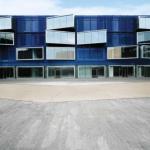 LOT-EK’s concept was to wrap the base building in a lightweight outer frame, like scaffolding, and drape it in blue mesh to resemble a building under construction. Some of the windows spanning the structural bays remain flush with the building, obscured behind the mesh. Other windows punch outward through the mesh, encased in satiny steel frames that look like gigantic ducts, and become articulated billboards.