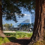 In contrast with its counterpart on the west, the east campus offers a more informal, meandering experience, with pathways that allow for relaxed, spontaneous navigation around clusters of indigenous redwoods.
