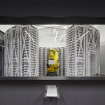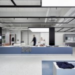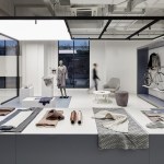 The concept area is the second area you encounter; it contains two white cubes, digital screens for presentations and an LED wall, giving it an iconic feel. Next comes an impressive exhibition area that is dedicated to Santoni’s machinery, fabrics and production process. This space has been divided into three different zones, each of which stands out as unique thanks to their different hanging light systems, colour schemes and partitions. This creates an area that’s fun and dynamic, yet easy for visitors to roam around whilst examining samples or products. The idea of encouraging visitors to search, explore and discover was central to Santoni’s vision and the resulting design, says Creative Studio Director Eva de Laat.