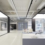 Santoni wanted a space that was flexible and easy to adapt to different uses and projects. To accomplish this goal, the architects designed the MEC with an adjustable hanging light system and low-levelled cabinets that were easy to move around. Simplicity and adaptability were central to the finished design. The idea was that the client could effortlessly slot in different products, samples and demonstrations within the space, using the areas provided.