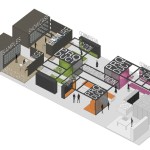 The exhibition area also features low cabinets for showcasing samples, along with a framed glass area with a touchscreen incorporated. The glass touchscreen will be used for storytelling; it will be used to illustrate the function and the process behind each item. Additional information can be added in the form of stickers which, when overlapping the item on the screen, could be used to create the effect of augmented reality.