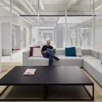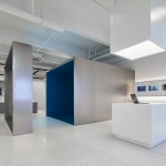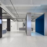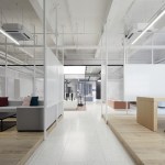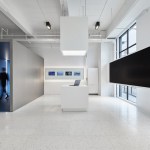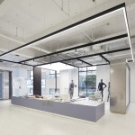 The company also requested a space that was open, luminous and high-tech. To achieve this effect, Bylu Design used crisp white paint and a terrazzo floor which enhanced and reflected the light coming in from the windows. To create a technological feel, they added elements like metal mesh, stainless steel, LED walls and touchscreens. In the areas where the interior needed to feel warm and welcoming, wooden floors and pastel colours were used to create a more human ambiance. The result is a clean, sophisticated and airy space where one feels in harmony with all that is technological and futuristic.