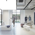 A special feature room offers the chance to discover new products and textiles, giving visitors a view of the latest projects. The room is separated by a white metal mesh partition giving it a private and cosy feeling. A long wooden table in the middle provides an excellent focal point and area for discussing samples and prototypes.