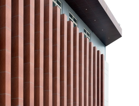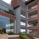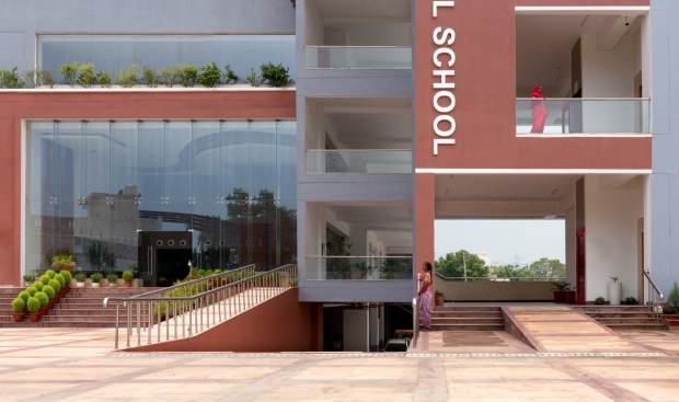 With a total built-up of over 1.5 lakh square feet, the school is divided into two distinct blocks – the admin block and the teaching wing, which does not make the building look bulky. The demarcation between the two blocks breaks the length of the facade and endows a visual connection to the space behind the school, establishing its extent. It also provides variance to the building character and generates interest in its form, fostering greater student engagement. The administrative block is relatively lower in height, with the entry leading up to a double-height reception and waiting area that includes all the offices. The building structure with the glass facade makes way for staggered terraces and recessed common spaces on the rear side of the block.