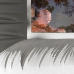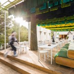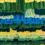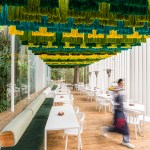 The exterior terrace features a colorful canopy, made of 1000 pounds of thread hanging from a steel structure, has tactile qualities of softness. The and is visually vibrant palette of greens and yellows blends and enhancing the surrounding vegetation. The source of our inspiration was the natural production techniques still used by indigenous people in Guatemala. The drying process of hanging treads is part of highly t traditional elements of craft culture. Ultimately this seemingly decorative element is highly pragmatic; acting as both a solar shade and sound absorbing surface which make the space cool and intimate.
