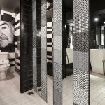 The monochrome bathrooms are made with an interplay of geometric tiles by Aparici and mirror. They create an unexpected experience, like a fun house or a maze, where you don´t know where the spaces end.