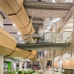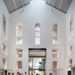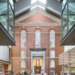 Library visitors enter through Stetson Hall’s lobby, which offers a framed view to the new space. The team removed Stetson Hall’s original cast iron and marble stack system, which did not meet modern accessibility requirements and repurposed the materials to created display cases, benches, and the flooring, creating a material link between the old and new spaces. To further bolster Stetson Hall’s prominence, the new library’s roof is tucked below its cornice line.