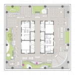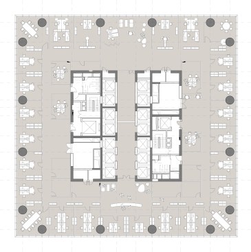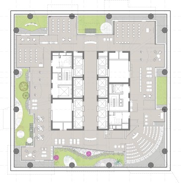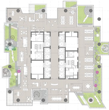 The tower building itself rises on top as a highly sculptured building with vertical gardens integrated in the architecture such giving the tower a very distinct appearance talking of alternative workstyle and sustainability. Vertically the tower is a layered structure featuring two different zones of 5 to 6 floors each which repeat alternating 3 and 4 times. One such zone has 6 identical floors with a square outer perimeter.