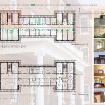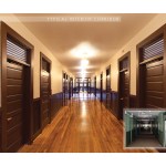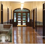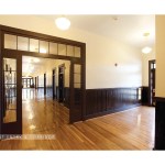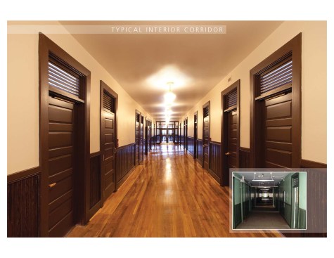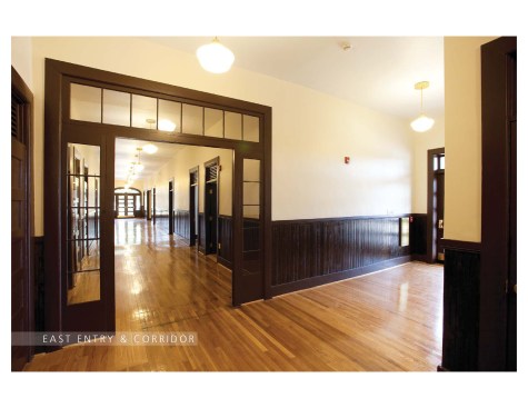 Original ventilating louvers in transoms over the corridor doors were left in place, with clear glass panels placed behind them, for acoustic privacy. Original doors were restored. Original windows were removed, restored and reinstalled; “storm windows” were introduced on the interior, within the sash, to provide thermal efficiency and preserve the original appearance. Layers of retrofitted flooring were removed to reveal original hardwood floors, which were restored throughout or replaced in-kind where rotted. Layers of paint were removed from beaded board wainscots to reveal original stain, which was then restored. Because plaster ceilings were severely damaged at corridors, loose plaster was removed along with exposed retrofitted sprinkler piping and electrical conduit. New systems were reinstalled tight against the existing plaster and a new gypsum board ceiling was installed, with historically accurate “schoolhouse” pendant fixtures. Because there were several original early layers of paint colors uncovered, existing plaster walls were restored and painted a neutral beige. Restrooms were expanded in the original restroom/shower locations and brought to current code. Stairs and guardrails were left in place with extensions added at guardrails for code compliance.