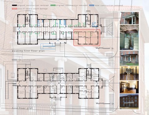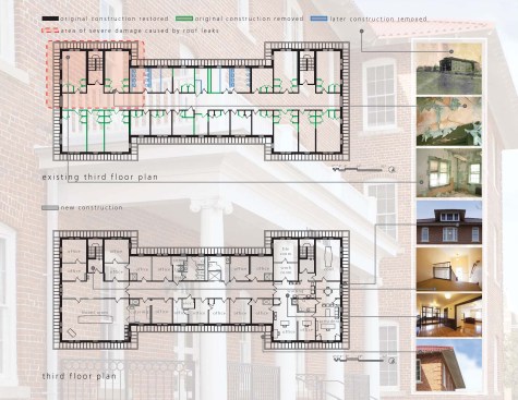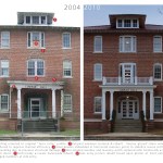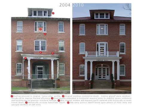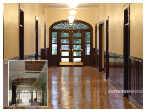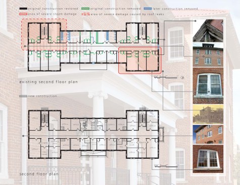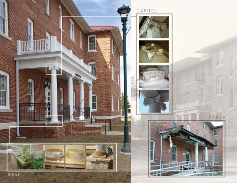 Exterior porches at the south and north had largely disappeared. Remaining parts of several column capitals were recombined and assembled into one complete column capital, to create a mold to replicate the remaining seven. One original column also remained which was used to replicate the others. Trim and balustrades, long gone, were recreated through archival photographs. An unsightly handicap ramp was removed from the main entry portico and a new one was placed at the less prominent south entry. Reinforcing rods were set into mortar joints to stabilize exterior masonry where buckling had occurred due to structural damage. Rotted rafters were mostly replaced and new campus-standard terra cotta profile roofing was installed to match the profile of the original roof.