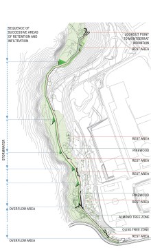Finally, the inner edge of the track, acting as a plant ditch, helps to channel runoff from the mountainside and generates a safety strip to stop minor landslips. These same fallen rocks are used to build a sequence of retaining walls with the aim of filtering and rechannelling much of this water to new points where vegetation has been planted to colonise the place. The same elements used to build the lineal benches in the rest areas are also used lower down to create spillways, allowing the water to continue its course in the event of heavy rain.