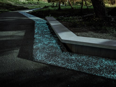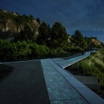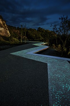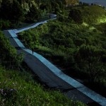 The central strip, with the main granitic-sand track, guarantees the continuity of the Green Ring. It is approximately three metres wide and its mostly laid out following the original path. This track is complemented by a second strip, in the form of a linear lookout overlooking the city of Igualada. This vantage point is materialised by a 1.2-metre-wide paved strip along the outer edge of the track, directly related to the views. It is built with hard paving, giving the track a strip with improved accessibility. In addition, the concrete used is made with luminescent aggregate that improves visibility during the evening by returning, in the form of luminescence, the solar energy captured during the day.