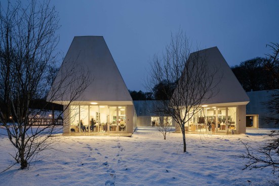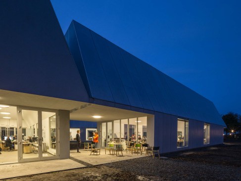Krabbesholm Højskole needed to expand and relocate their studios for art, architecture, graphic design and photography. The arrangement of the studios produces informal interconnected exterior courtyards and studio buildings with large windows and covered porches which foster social and visual interaction.