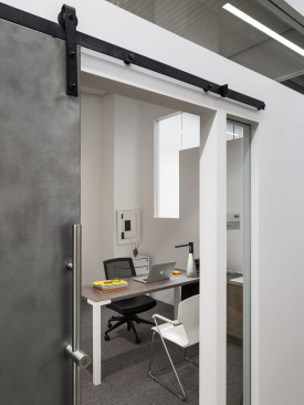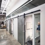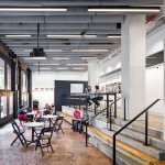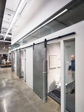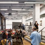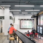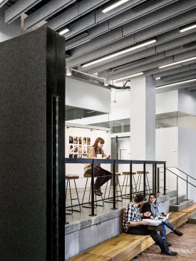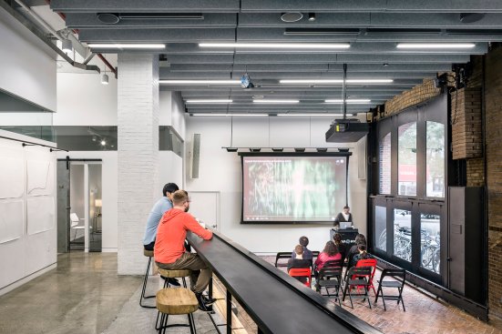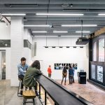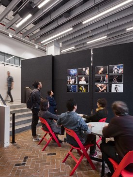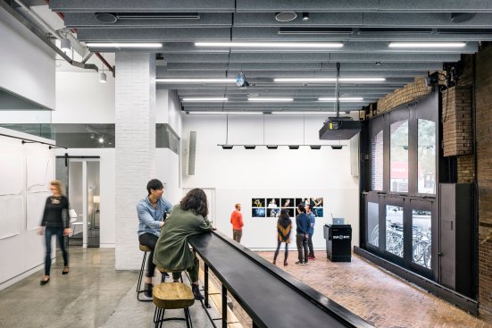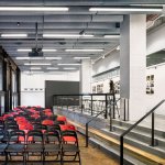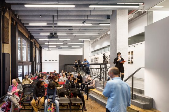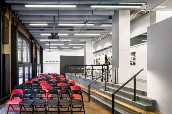 The School of Visual Arts MFA Photo, Video and Related Media Department, newly renovated and expanded. Located at ground level, the original space was cut off from the street by three disused loading bays. The new design reclaims the vestigial industrial space, expanding the usable footprint and creating an active, multipurpose social space. The 10,000 sf project for repeat client SVA includes renovating photography studios, classrooms, and administrative spaces, as well as opening up the sealed façade of this former warehouse to maximize daylight and visibility.
