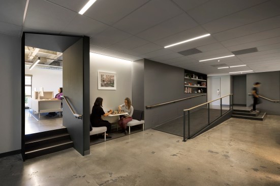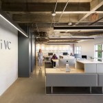 From the main entrance, a clear visual connection to the workstations allows guest and potential investors to navigate the space, displaying a sophisticated, yet welcoming environment. Walls, ceiling, and flooring were removed to expose the natural raw materiality of the existing core and shell to showcase a classic, minimalistic, and sharp look. New steps and accessible ramp were added to improve the connectivity across the office.