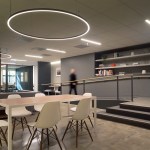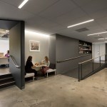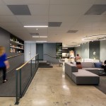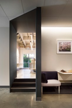 A dedicated, multi-functional “living room” was designed for staff and guests to gather, work, socialize, and play. This space encompasses the break area, lounge, and family-style dining table. The collaborative living room area was also designed to encourage interaction and allow for an easy transition from small social events to large presentations. Dark grey portals frame the openings connecting the workstation area to the living room.