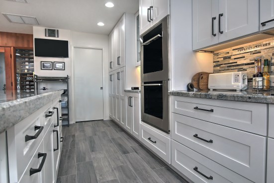 Built in 1953 this ranch-style home in Scottsdale was in need of a kitchen makeover. The original kitchen/dining area totaled approximately 280 sq. ft. After complete demolition we opened the back of the home and extended it with an addition to approximately 640 sq. ft. This supplied us with enough room to redesign the main footprint and layout. The home owner requested a couple specialty items to turn this project into a fully serviceable area to meet their needs. There exact words were an “extremely large island” and a “wine cellar” to help with entertaining friends and family. The island ended up around 9' long x 5 1/2' wide and in a Group 5 granite. The granite has a vein that crosses in the island to create an “X” marks the spot conversation piece representing hidden treasure under the granite. You will have to receive the information on what is buried at that spot from the homeowner. The wine cellar is constructed out of “heart” redwood stacking 2 bottle deep horizontally. The entrance is a custom made redwood door with solid side lights including insulated glass. A custom handle artistically painted to give that old vine representation. For only measuring 7 1/2' wide x 6' deep and an 8' ceiling, this cellar has capacity for over 11,000 bottles. A small but mighty cellar indeed! Custom shaker style, white cabinets give this kitchen a contemporary feel. Slide out rolling drawers at every corner makes it easy to operate and find things. Full glass backsplash, LED under cabinet lighting and “touch” style faucet brings it up to current speed. Porcelain plank style flooring for durability and the gray wood tone brings in the white cabinets and the granite finishes. State of the art Wolf double ovens and cooktop all in digital operation for sophistication and satisfaction for the electronic minded owner. One aspect of this project that doesn’t show up in the photos is the Wi-Fi activated controlling. Legrand switches and controls for the lighting all operated through “Alexa” by voice command. The homeowners were very helpful in guiding us to the set up that they wanted to achieve. This kitchen is truly the focal point of the home and state of the art operation. Special thanks to the Heritage Team building such a satisfying remodel.