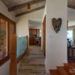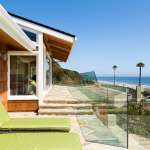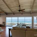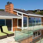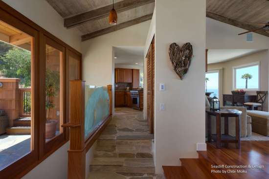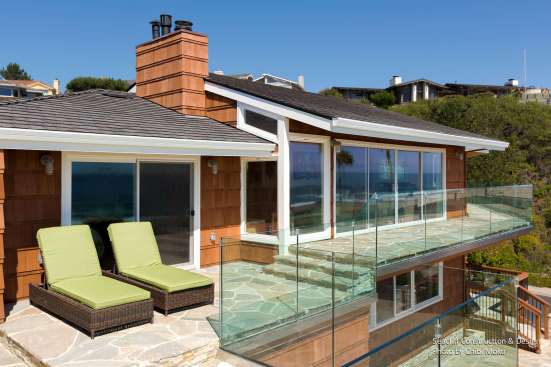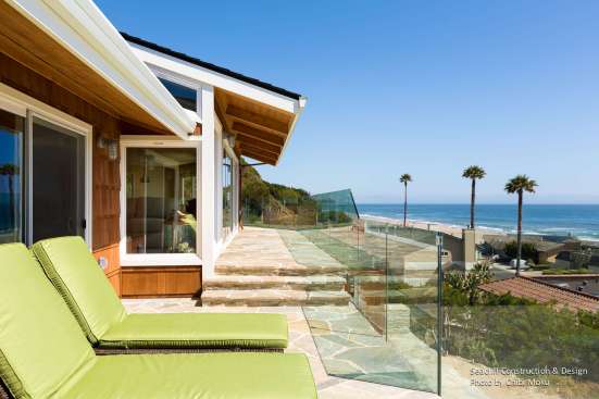 We added a glass railing with custom etched wave design for the entry stairway, and a frameless glass railing for the exterior ocean facing decks to create an unobstructed view of the ocean from the living room, kitchen, and master suite.