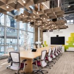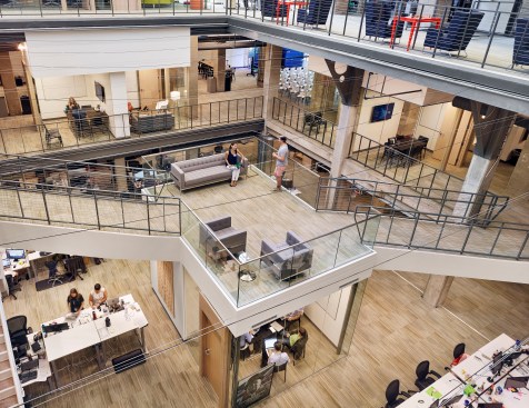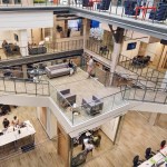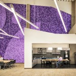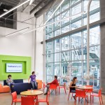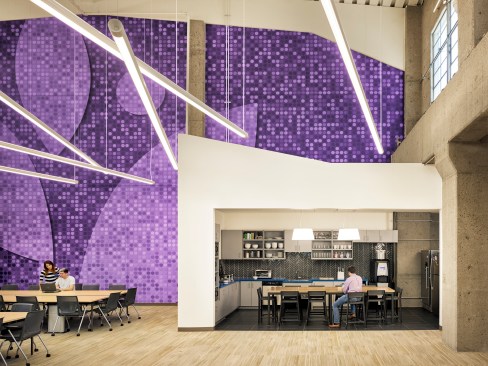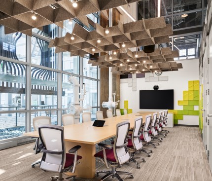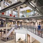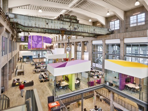 Turbine Hall—the large, central space— provides a “field” for open workstations and glass meeting rooms. These glass meeting spaces, known as “huddle rooms,” are capped with colorful, faceted roofs that punctuate the length of the vast space with the company’s brand colors. Integrating forward-looking information technology was central to the design but also the inclusion of historic artifacts, celebrating the building’s roots.