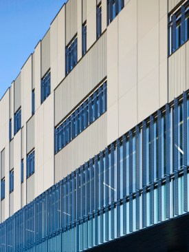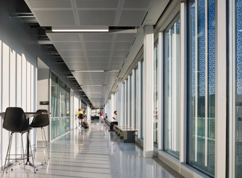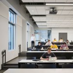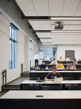 The Annex features new formal and informal research spaces, varied sizes of active learning classrooms, student development and tutoring spaces, and the creation of a new common lobby centered around a technology-rich student project design studio that brings the entire engineering community together. This includes 4,000 SF of student collaboration space, including more than 200 seats for work groups, and a 128-seat, state-of-the-art, tiered lecture hall with three giant screens. Renovation work in the existing building includes creating an Engineering Learning Commons adjacent to the engineering library space. The Commons will include flexible study and presentation spaces for faculty and students use.