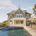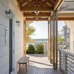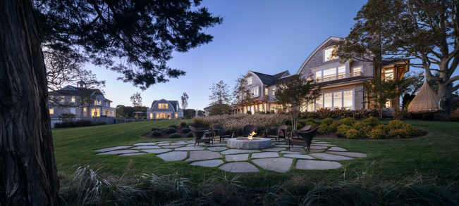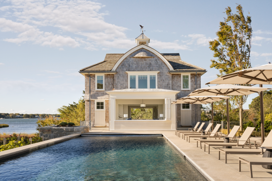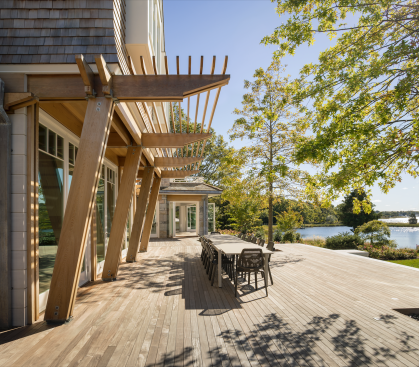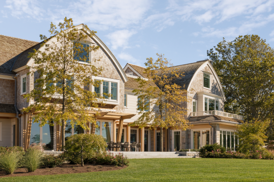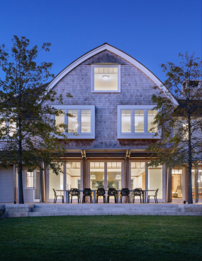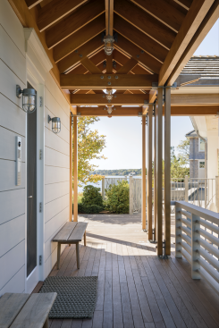 Set on an island, this house and accompanying buildings serve as an inviting summer campus for extended family. The sustainable and resilient program explores playful expressions of design through unique features such as curved roofs, interiors, and a single-loaded plan framing water views on either side. The aesthetic is driven by a modern homage to the craftsman-built bow-roofed house of early Cape Cod, with contemporary forms rendered familiar through the use of traditional weathering exterior materials of red cedar and local granite.