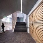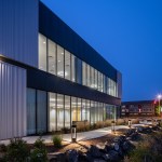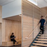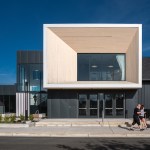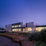 New exterior materials balance aesthetic appeal with durability in oceanfront conditions. Angled 6” and 12” metal panel modules create vertical striations that, at a distance, mimic the tones of a coastal cabin’s weathered wood. Alaskan yellow cedar highlights the Center’s entrances and the new Northwest corner meeting room and will weather to a whitened finish. All coatings are specific to the coastal climate. On the interior, a neutral color palate of new carpet, wood details, and paint is punctuated by color to mark new concession space and restrooms. Glass railings on the mezzanine and grand stair and supergraphic room labels ease wayfinding. Upgraded lighting and technology enhance each meeting space.