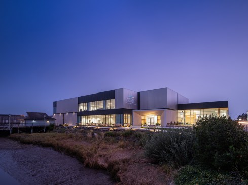 To improve circulation throughout the building and unite the spaces, a new, continuous prefunction space runs the length of the building. The relocation of the restrooms and storage block from the Necanicum River side opens views from the lobby/prefunction spaces out to the water.