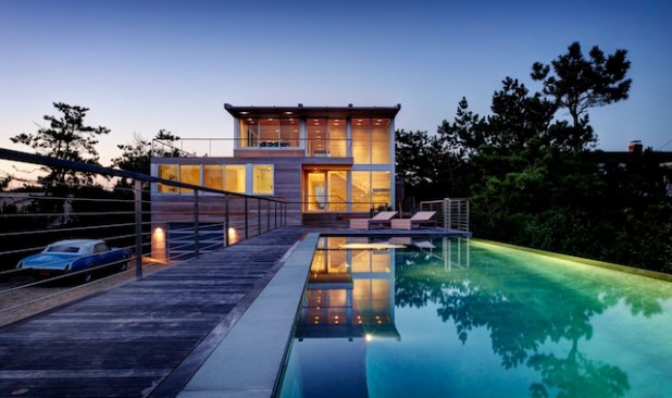 An infinity edge pool was placed between the house and bay, bridging the two bodies of water, helping to mask the street.