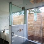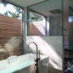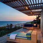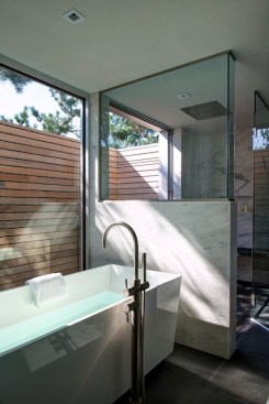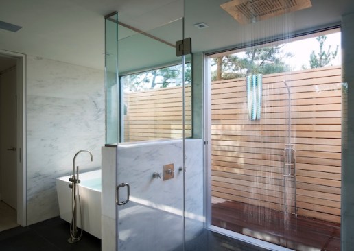 The public spaces were located on the upper floor, extending out onto a series of decks. A wooden cantilevered trellis extends through the house from ocean to bay. The lower floor is separated into guest and owner spaces. The master bath extends out onto a private, louvered deck, allowing ocean and bay breezes while maintaining privacy.