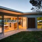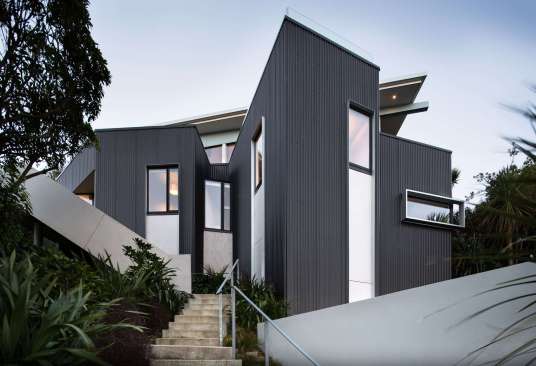 The bedroom level is excavated back into the hillside forming a base to the upper, lighter and more open living level. It undulates in and out, allowing light in and views out, giving each bedroom a different character and aspect. Clad in dark vertical corrugated iron it anchors the form into the site and is intended to develop a relationship with the established