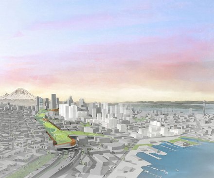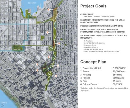 The C.A.P. project proposes a city-wide architectural infrastructure solution to multiple issues facing the fast growing city of Seattle. The rapid expansion of the urban core of the city has made the condition of I-5 slicing through multiple neighborhoods untenable. Recovering the space lost to the freeway is the initial generator, covering the expansive swath of land with a 45 acre, 2 mile long park creates a public benefit of an enormous scale. The park would be situation on a structural cap build over the existing interstate, starting at the Lakeview overpass on the north end, running along the western edge of Capitol Hill towards the downtown core. As the park intersects Denny Way the topography begins to rise, responding to the density of the surrounding buildings. The proposed program under this portion of the park includes two phases of expansion for the Washington State Convention Center. This section completes two of the most egregious holes in the current urban fabric, covering up I-5 between the Pike and Olive and Boren Avenue. The park continues to swirl into the downtown core while rising to its highest point. Under this section of the park a 20,000 seat hybrid arena / convention space is situated over an existing transit stop with a connection to light rail. The arena will house both an NBA and NHL team and on off-nights it can be reconfigured into smaller spaces that can be utilized by the Convention Center. The hybrid arena / convention space has the potential to be utilized for conventions 75% of the calendar year.