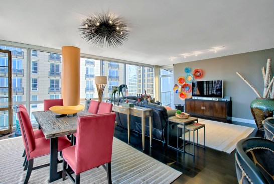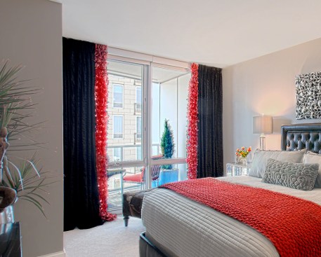 Michelle also had a contemporary window treatment installed, which framed the homeowners’ view of the city. Draperies were custom-designed with red fringe borders, and a hint of elegance was imbued nearby with two shimmering, mirrored nightstands.