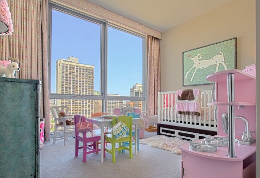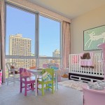 Instead of overloading the room with the sometimes-expected pink, Michelle decided upon a more neutral palette as a foundation and sprinkled in touches of pink with accessories. As with the master bedroom, the nursery also has a full-length window with an impeccable view of the city. Michelle, designed a custom valance to add decoration and a practical light cover.