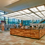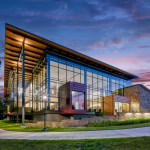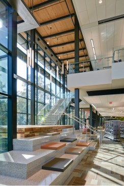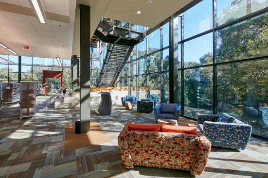 The new building enables the library to expand its collections and technology as well as facilitate additional opportunities for collaboration. Nine glass-enclosed spaces accommodate meetings and study groups, and a large community room is available for after-hours use.