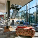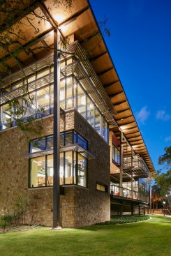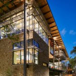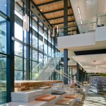 The 43,000-square-foot structure was designed to preserve as much of the site’s natural habitat as possible. Shaped to fit within several existing heritage trees and with ample glazing, the building successfully blends exterior and interior environments.