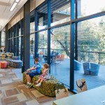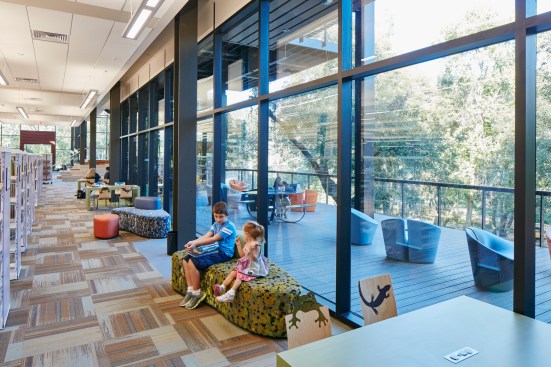 Located on a wooded site overlooking Walnut Creek, this contemporary two-story library embraces its scenic natural surroundings.