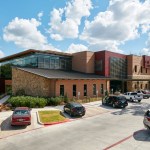 The use of local limestone and brick with exposed wood roof decking enrich the exterior, while colored metal panels highlight showcase spaces that project from the building. Cantilevered decks overlook the adjacent Walnut Creek and intercity hike-and-bike trail and an enclosed quiet room with floor-to-ceiling glass on three sides extends out into the branches of a pecan tree, providing visitors with the experience of sitting in a treehouse.