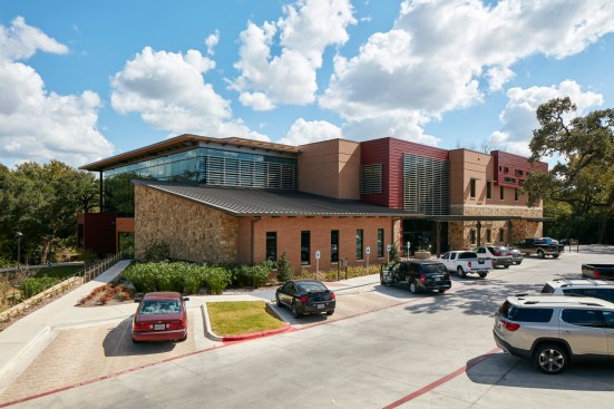 Champagne-colored aluminum sunscreens strategically shade the high-performance glass covering nearly 40 percent of the façade, delivering abundant natural light to the interior. Salvaged wood from a small number of pecan trees removed at the site was repurposed as flooring and unique live-edge furnishings throughout the facility.