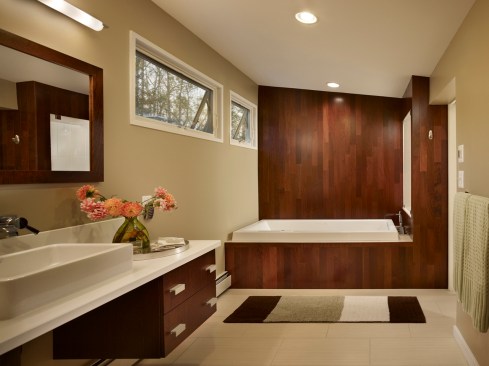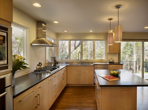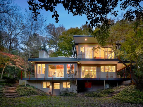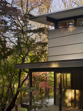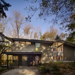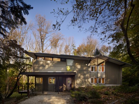 Metcalfe Architecture & Design completed the renovation of a mid-century modern kit house in Conshohocken, PA, which included the design of a new master suite and renovation of bedrooms, bathrooms, kitchen, family and living room. The original building is one of a suite of three kit houses (by TechBuilt) constructed in 1955 by architect William Hough, Jr., and did not take full advantage of its location in the trees. A sky-lit, vaulted ceiling and kitchen were added in 1970.