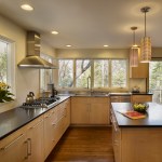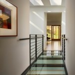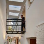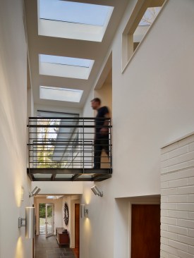 Our design pushed the upper level of the house into the treetops, transforming it into a home in the sky, with an expanded second-floor living space and entry; and renovated kitchen, living areas, and bathrooms. We reconfigured the small, existing entrance into a sky-lit two story entry hall paved in slate, crossed above by a steel-and-glass footbridge. This hallway now leads a visitor into progressively more open kitchen, dining, and living spaces. In the kitchen area we minimized overhead cabinets which allowed for a band of windows that provide panoramic views of the outdoors.