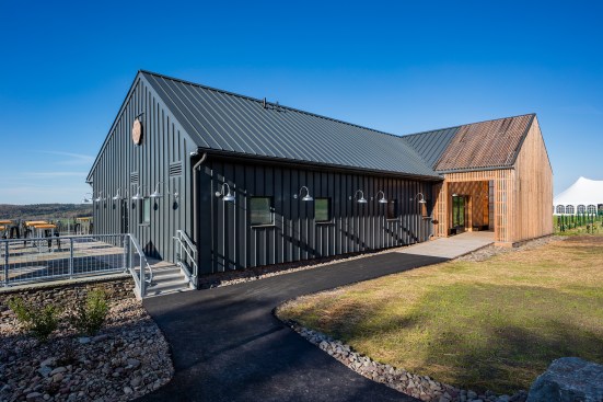 In 2012, Douglas Doetsch and Susan Manning returned to their families’ agrarian roots and opened an organic apple orchard in Callicoon, N.Y. After developing their crops, the couple contacted the Hudson Valley, N.Y.–based River Architects in 2014, outlining plans for a cidery on their land at the foothills of the Catskills. But as the group toured the 62-acre property, a sloping, open parcel overlooking rolling hills and the Delaware River captured their attention. The project vision became a new, bank barn–inspired cidery that could help sustain the Hudson Valley as a tourist destination and place of employment. Completed in June, the two-story, 9,300-square-foot Seminary Hill Orchard and Cidery merges sustainable agriculture with environmentally conscious architecture.