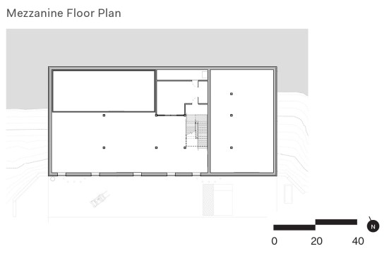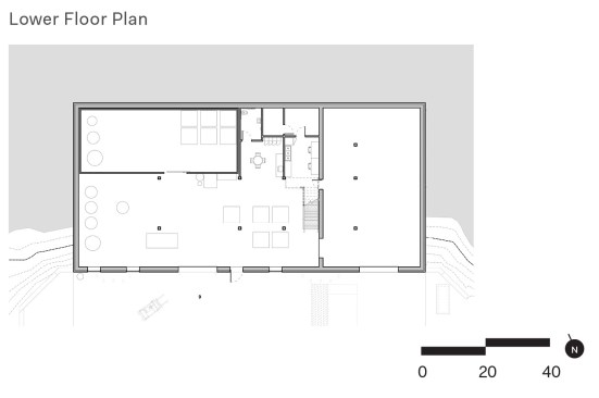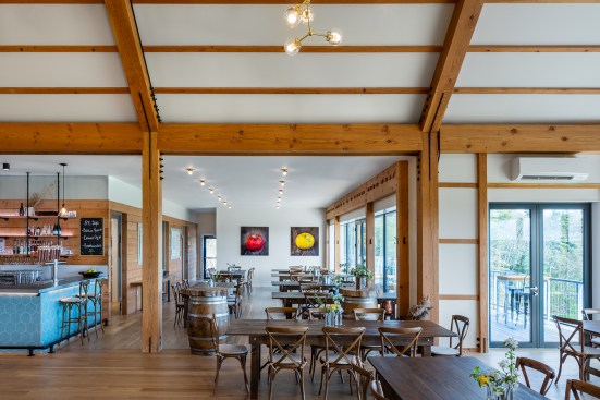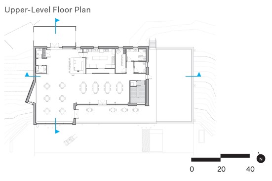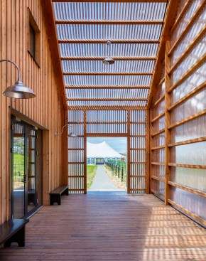 For the upper level, the architects used structural insulated panels while maintaining extensive access to daylight and exposed timber beams. A blue-tiled tasting bar between the entrance and a commercial kitchen invites visitors to linger. The design team also installed a south-facing pop-out window bay on the structure’s western wall to deflect any blistering sunlight that might overheat the space. “Instead of having a big, long blank wall, we were able to break in and create deep penetrating light and views,” Hartford says.