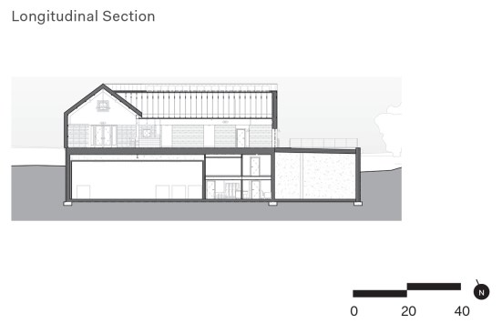 With its gabled roof and larch siding—a naturally rot-resistant wood reclaimed from the original Tappan Zee Bridge—Seminary Hill embraces classic agrarian forms while its standing-seam metal roof and photovoltaic array hint at the structure’s passive nature. An open-air entry clad in larch slats over polycarbonate nods to the breathability of hay barns, offering a sheltered transition between the interior and exterior—and an inviting glow when illuminated at night.