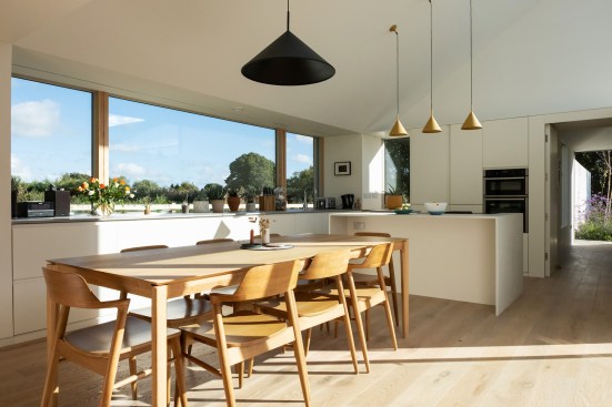 appropriate to each of the spaces. In the dining room a long horizontal window frames a view through to the cattle